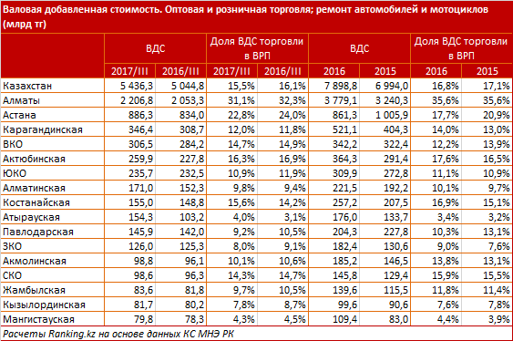 Примечательно, что обе столицы лидируют не только по объемам ВРП в торговом секторе, но и по доле торговли в валовом региональном продукте. Так, в финансовом центре - Алматы - торговые компании обеспечили 31,1 процента от ВРП, в Астане - 22,8 процента.