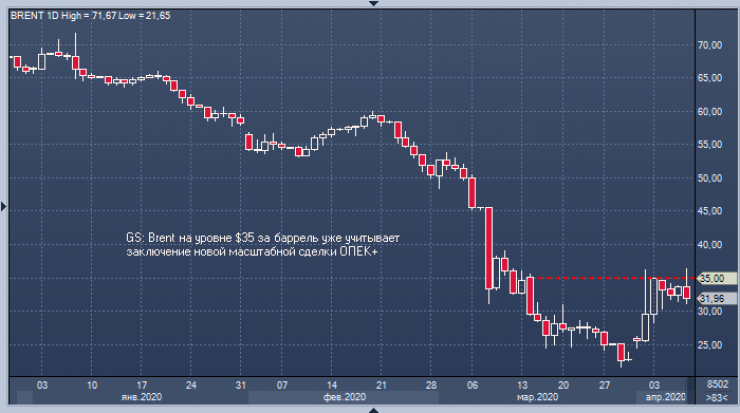 Profinance.ru со ссылкой на экспертов Goldman Sachs сообщает, что договоренности о сокращении добычи нефти на 10 миллионов баррелей в сутки, из которых реальными окажутся только 6,5 миллиона, будет недостаточно, чтобы компенсировать падение мирового спроса. Балансировка рынка потребует реального сокращения добычи нефти как минимум еще на 4 миллиона, поэтому формальный заголовок нового соглашения должен быть ближе к 15 миллионам баррелей в сутки.