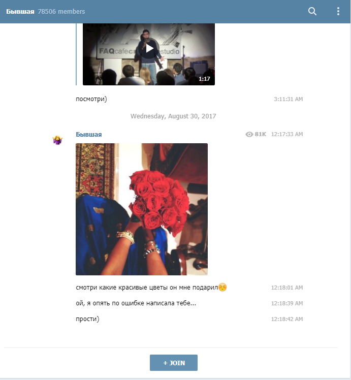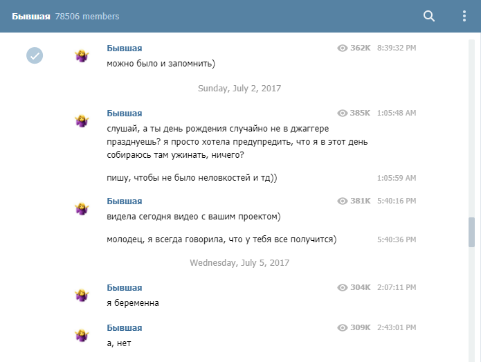 Telegram-канал "Бывшая" с выдуманными сообщениями от бывшей девушки был создан в июне 2017 года и быстро набрал вирусную популярность: за первые две недели на него подписались 35 тысяч человек. Сейчас число подписчиков превышает 75 тысяч.