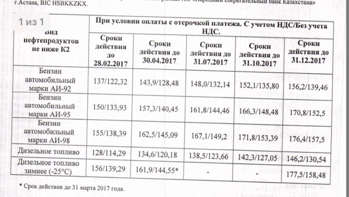 Рассылаемая в соцсетях фотография документа, на которой указано, что цены на бензин марки АИ-92 до конца 2017 года составят 156,2 тенге при условии оплаты с отсрочкой платежа, является копией коммерческого предложения по ценам на нефтепродукты. Об этом корреспонденту Tengrinews.kz сообщили в  компании "КазМунайГаз Өнімдері", отвечая на запрос.