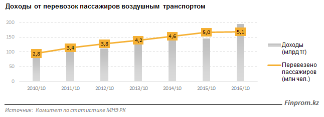 Однако резкое увеличение выручки за счет удорожания стоимости пассажирских перевозок произошло на фоне снижения реальных доходов населения РК. Как отмечают аналитики, за 10 месяцев 2016 года авиакомпании перевезли всего на 71 тысячу человек больше, чем в прошлом году. В течение 2010-2015 годов объем перевозок пассажиров в среднем увеличивался на 450 тысяч человек в год.