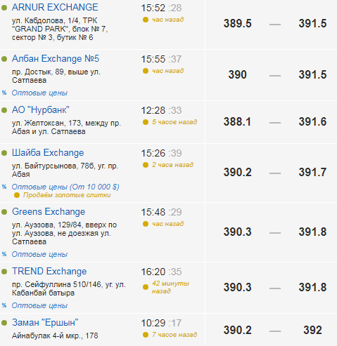 По данным портала, американская валюта стоит в обменных пунктах в пределах от 390,7 до 391,8 тенге.