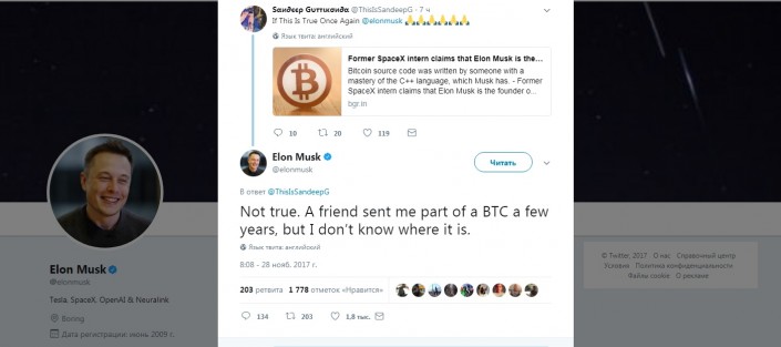"Это неправда. Друг отправил мне часть BTC несколько лет назад, но я не знаю, где они", - написал Маск в Twitter-аккаунте.