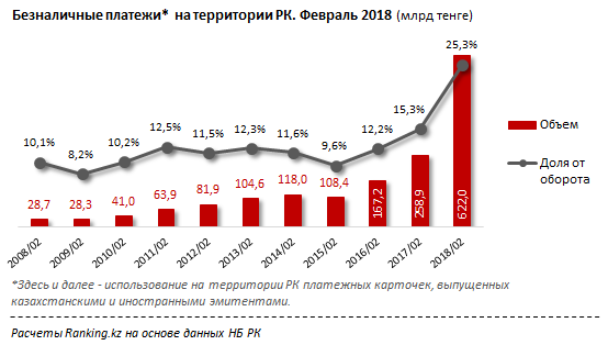 Примечательно, что выдача наличных выросла на 28,1 процента, до 1,8 триллиона тенге. Объем безналичных платежей вырос сразу в 2,4 раза, до 622 миллиарда тенге, что позволило увеличить их долю за год с 15,3 процента до 25,3 процента от всего оборота по платежным картам.