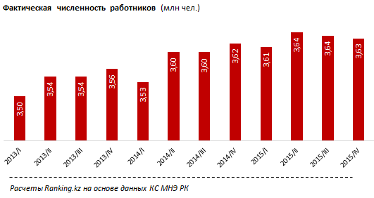 Как сообщает аналитический портал, в четвертом квартале 2015 года фактическая численность работников в Казахстане составила 3,629 миллиона человек. Отметим, что за год количество работающих увеличилось на 0,3 процента. За последние два года прирост наемных работников составил два процента.