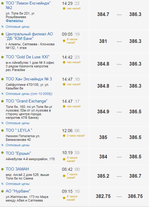 Отметим, что, по данным сайта kurs.kz, в обменниках Алматы стоимость иностранной валюты варьируется от 385,2 до 386,75 тенге за доллар.