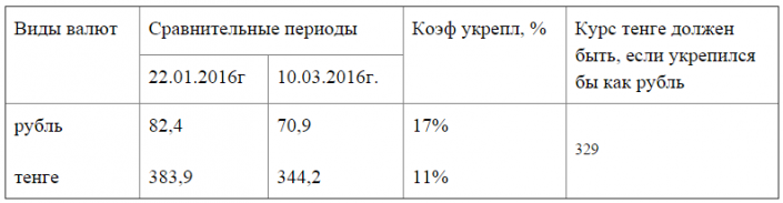 Уже сейчас, по его мнению, тенге должен стоить ниже 330 за доллар. Эксперт отметил, что в целях основы для анализа он взял динамику изменения валюты нашего партнера по Евразийскому союзу - России. "Наши страны по существу однородны в части структуры продукции, приносящей валютную выручку от экспорта (нефть, газ, полезные ископаемые, зерно) и также немаловажно отсутствие таможенных барьеров внутри Евразийского союза", - говорит он. По его данным, максимальный пик падения курса рубля и тенге совпал с датой минимальной цены нефти 22 января 2016 года. "С этого момента прошел процесс роста стоимости нефти с одновременным укреплением рубля и тенге в одинаковом режиме, что подтвердило правильность этого подхода", - говорит Байганов.