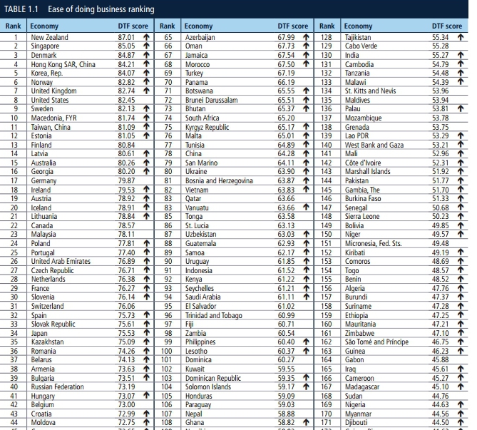 Всего в списке представлено 190 стран, включая Сомали. Возглавила рейтинг Новая Зеландия, лидер прошлых десяти лет - Сингапур - спустился на вторую строчку. Третье место заняла Дания. В десятке оказались Гонконг, Южная Корея, Великобритания, Норвегия, США, Швеция и Македония.