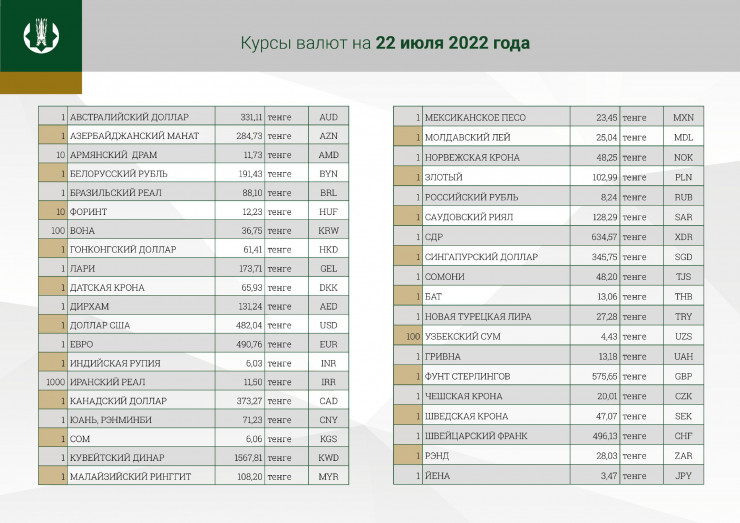 Национальный банк Казахстана установил официальный курс доллара и рубля к тенге на 22 июля, передает корреспондент Tengrinews.kz.