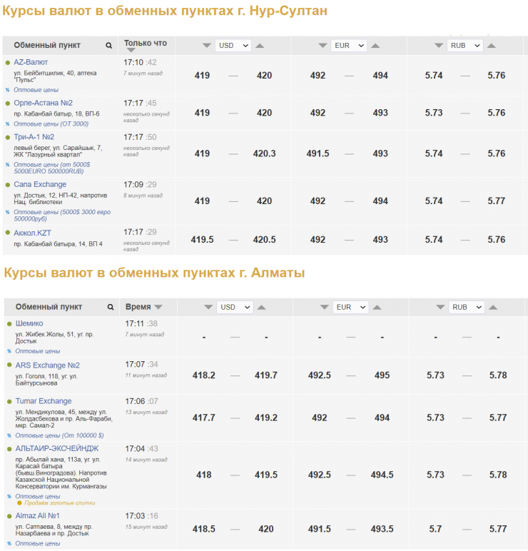 По данным kurs.kz, в настоящее время в обменных пунктах Нур-Султана продажа доллара сложилась на уровне 420-420,5 тенге, покупка - 419-419,5 тенге. В Алматы доллар продают за 419,2-420 тенге, покупают за 417,7-418,5 тенге.
