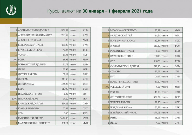 Официальный курс доллара к тенге на 30 января по 1 февраля будет составлять 424,22 тенге. При этом официальный курс на 29 января составляет 423,42 тенге. Курс доллара вырос на 0,80 тенге.