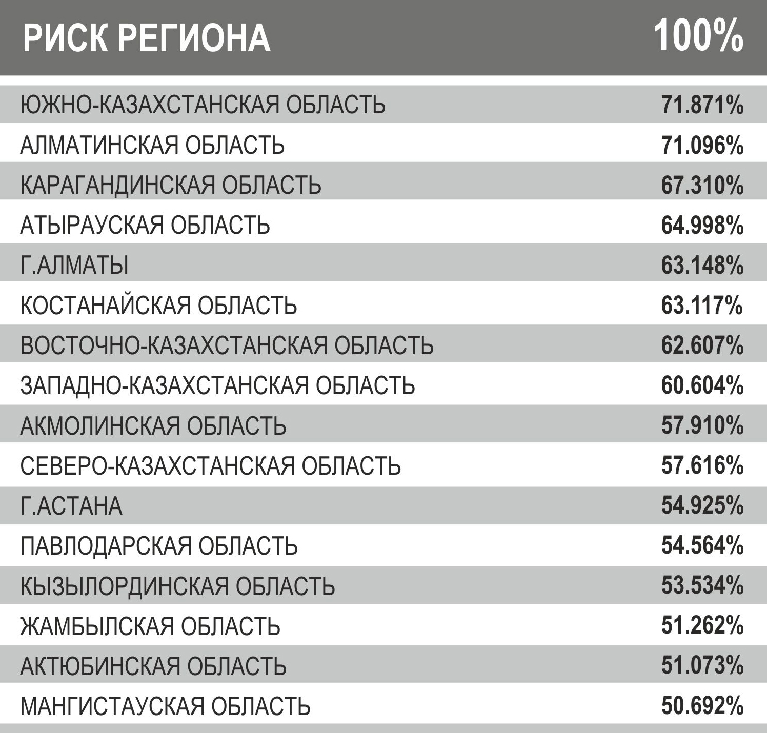 На втором месте оказалась Алматинская область с уровнем безопасности 71,1 процент. Как сообщается, Алматинская область - единственный регион, где сумма выданных кредитов не превышает доход населения.  В тройку лидеров вошла и Карагандинская область, где уровень риска составляет 67,3 процента. Отмечается, что из-за высокого показателя дефолта Алматы занимает лишь пятое место с уровнем безопасности 63,1 процента. Как оказалось, жителям города было выдано кредитов в четыре раза больше, чем они могли бы покрыть своими доходами. Самым нестабильным местом для развития предпринимательства оказалась Мангистауская область с уровнем безопасности 50,7 процента.