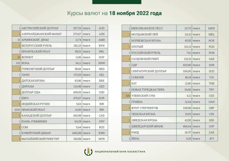Национальный банк Казахстана установил официальные курсы доллара и рубля к тенге на 18 ноября, передает корреспондент Tengrinews.kz.