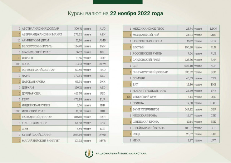 Национальный банк Казахстана установил официальные курсы доллара и рубля к тенге на 22 ноября, передает корреспондент Tengrinews.kz.