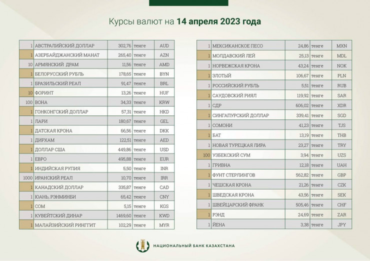 Национальный банк Казахстана опубликовал официальные курсы иностранных валют к тенге на 14 апреля, передает корреспондент Tengrinews.kz.