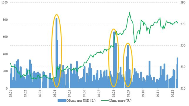 "Объемы торгов на KASE долларом существенно увеличивались в апреле, августе и сентябре после анонсирования новых ограничений против некоторых российских компаний и физлиц", - отметили в ассоциации.