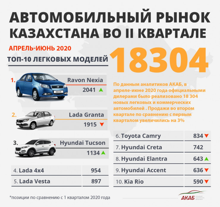 В разрезе легковых моделей по итогам второго квартала лидирует Ravon R3 – 2 041 cедан. На второй позиции - Lada Granta (1 915 единиц). Тройку лидеров замыкает – Hyundai Tucson (1 134 единицы). Четвертое место - Lada 4x4 (954 единицы). Далее по списку: Lada Vesta (897 единиц), Toyota Camry – 834 единицы, Hyundai Creta (742 единицы), Hyundai Elantra (643 единицы), Hyundai Accent (636 единиц) и Kia Rio (590 единиц).