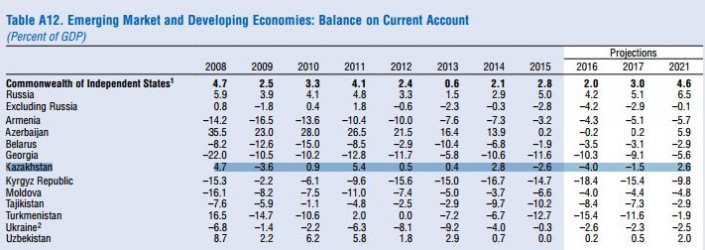 МВФ считает, что в 2021 году Казахстан будет одной из четырех стран СНГ с профицитом счета текущих операций: Азербайджан (5,9 процента), Россия (6,5 процента), Узбекистан (2 процента) и Казахстан (2,6 процента). У остальных стран региона ожидается дефицит даже через пять лет. Это можно увидеть в таблице, представленной выше.