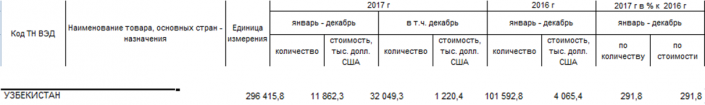 В январе-марте 2018 года экспорт цемента в Узбекистан составил около 265 тысяч тонн и принес 11 миллионов долларов. За аналогичный период 2017 года цифры были отмечены на уровне 100 тысяч тонн и 3,9 миллиона долларов. Экспорт увеличился на 264,1 и 276,8 процента соответственно.