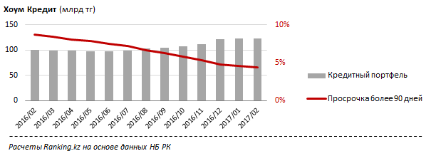 Хоум Кредит Банк за период февраль 2016-2017 показал прирост-на 21,3 миллиарда тенге (21,1 процента) и составляет 122,1 миллиарда. Доля просроченных кредитов свыше 90 дней сократилась с 8,7 процента до 4,4.