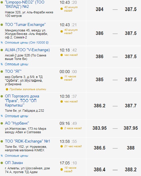 Первая сделка торгов 22 августа прошла по цене 385,5 тенге. Это и стало минимальной стоимостью. Максимальная цена достигла 386,2 тенге. Объем торгов достиг 27,41 миллиона долларов.