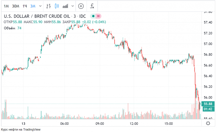 По данным TradingView, на данный момент цена нефти марки Brent опустилась до 55,88 доллара за баррель.