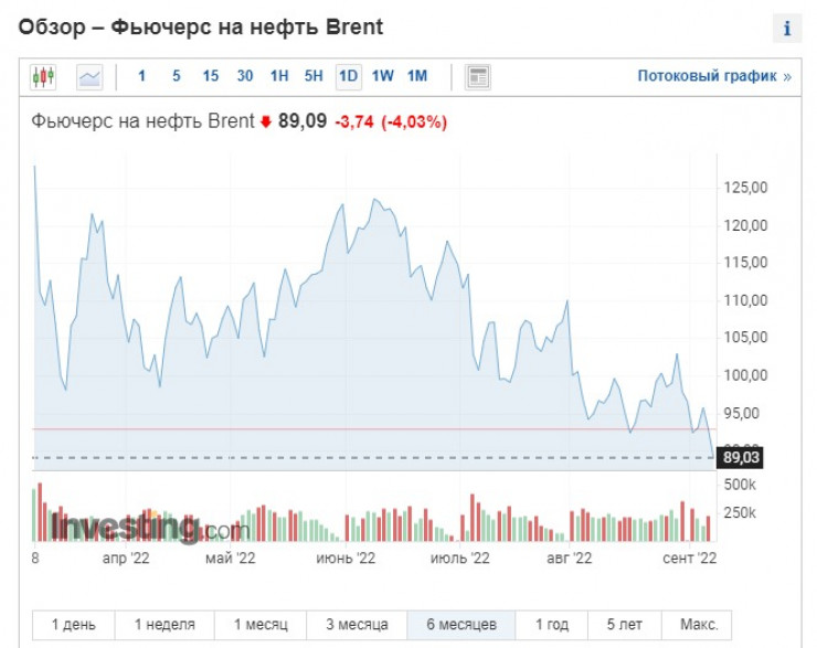 Цена нефти Brent опустилась ниже 90 долларов впервые с февраля