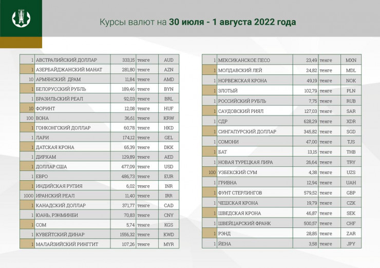 В выходные дни и понедельник официальный курс доллара будет равен 477,09 тенге. Отметим, что официальный курс американской валюты на 29 июля составляет 478,78 тенге.