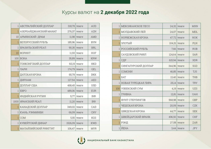 Национальный банк Казахстана установил официальные курсы доллара и рубля к тенге на 2 декабря, передает корреспондент Tengrinews.kz.