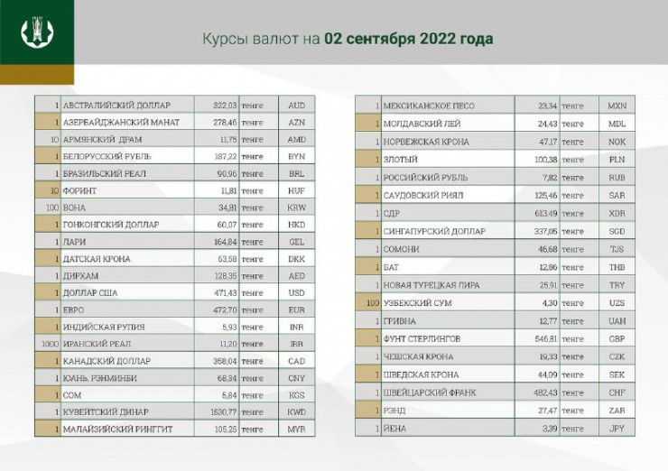 Национальный банк Казахстана установил официальные курсы доллара и рубля к тенге на 2 сентября, передает корреспондент Tengrinews.kz.