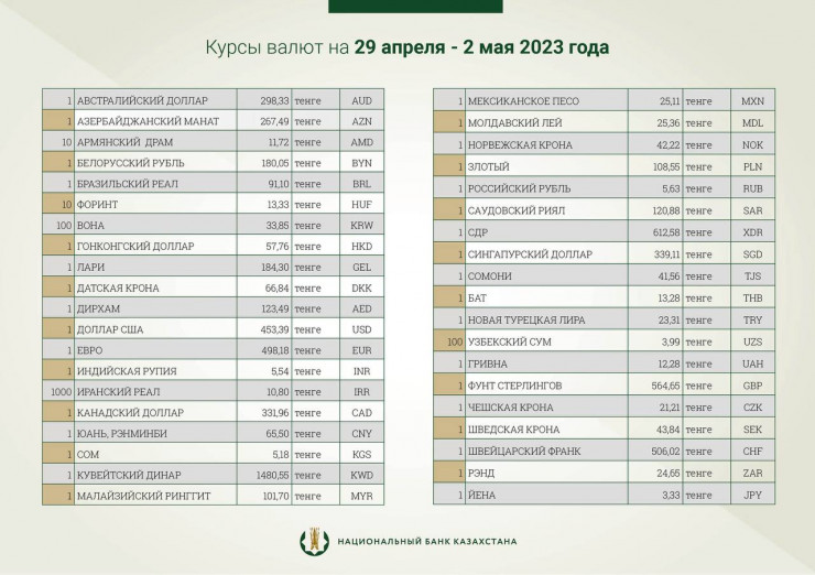 Официальные курсы валют на 29 апреля - 2 мая 2023 года: