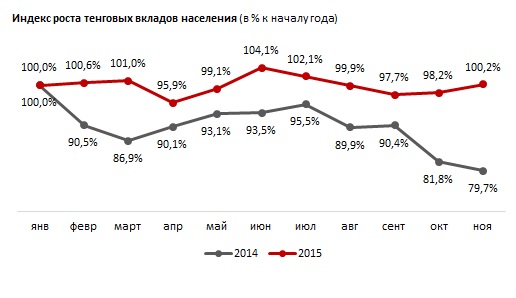 "В 2014 году динамика изменения объема тенговых вкладов физлиц была более нервной, сказывалось избыточное давление девальвационных ожиданий. В результате за 11 месяцев 2014 года депозитный розничный портфель потерял 20,3 процента в размерах. При этом уровень долларизации розничного рынка вкладов в РК продолжает расти. Если годом ранее в структуре депозитов населения доля вкладов, номинированных в нацвалюте, составляла 39 процентов, то к началу декабря 2015 года доля таких вкладов снизилась на 17 процентов - до 22 процентов", - сообщает издание.