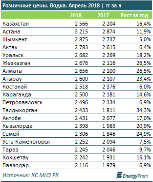 По итогам апреля текущего года водка обходилась казахстанцам в 2565,7 тенге за литр, на 16,4 процента больше, чем годом ранее.