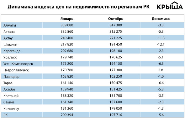 Отрицательная динамика в октябре наблюдалась в Актобе (минус 0,5 процента), Усть-Каменогорске (минус 0,8 процента), Павлодаре (минус 1 процент). Лидерами снижения в этом месяце стали Тараз (минус 3,5 процента) и Шымкент (минус 2,2 процента). Кстати, областной центр ЮКО, по предварительным итогам, станет лидером среди городов с наиболее подешевевшим жильем. Индекс там потерял более 12 процентов, или 26 370 тенге, за десять месяцев. За ним следует Актау (минус 11,3 процента), Тараз (минус 6,6 процента), Усть-Каменогорск(минус 6,3 процента) и другие.