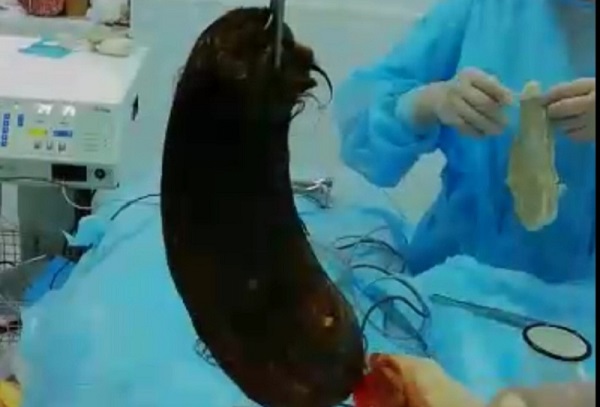 Как рассказала мать девочки, дочь проглатывала кончики волос много лет. В последние два-три года у подростка началась рвота, девочка стала бледной, замкнутой, худела, но живот увеличивался. На обследовании на компьютерном томографе врачи обнаружили в ее желудке огромный волосяной комок.