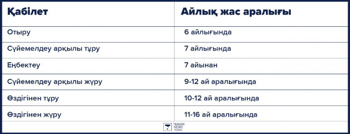 "Баланың еңбектеуі, жүруі әркімде әрқалай, оның бұлшық ет тонусына, физикалық дамуына байланысты. Бұл да дайындық арқылы келеді, оған гимнастика әдістерін жасатып, массаж жасау керек. Бұлшық етті шыңдау керек. Баланың өздігінен жүруі 10 айдан бастап 1,5 жасқа дейін. Егер сәби 1,5 жасында өздігінен жүрмейтін болса, онда дәрігерлерге қаралу керек. Ата-анасының мамандығы баланың дамуына әсер береді деп айту қиын. Өйткені барлығы да баламен қанша уақыт айналысқанына, жаттығулар жасағанына байланысты. Алайда әке-шешесі белсенді, шапшаң болса, баласы да сондай болады деп айтуға негіз бар. Керісінше ата-анасы байсалды, сабырлы болса, баласы да сондай болады", - дейді Елена Олеговна.