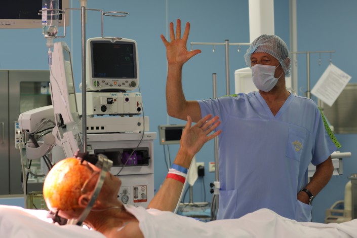 На операционном столе - пациент, которого доктора называют "возрастным": ему 69,  из них девять лет прожиты с болезнью Паркинсона. Введение общего наркоза для него, говорят врачи, уже риск: во время этой операции анестезия будет местной, то есть все время пациент будет находиться в сознании. Это необходимо еще и для проверки его реакции в момент введения электродов и проведения манипуляции на мозге.