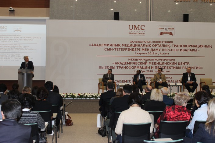 Участников конференции поздравили вице-министр здравоохранения РК Олжас Абишев, провост АОО "Назарбаев Университет" Адесида Илесанми, вице-президент по медицине - декан Школы медицины АОО "Назарбаев Университет" Массимо Пиньятелли, медицинский и научный директор UPMC International Бруно Гриделли, председатель правления UMC Жаксыбай Жумадилов и другие.