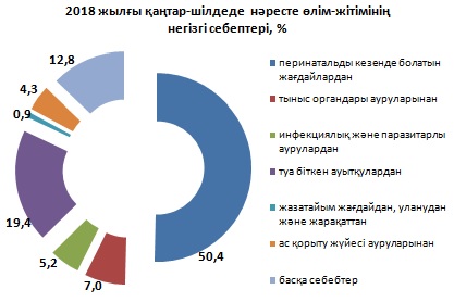 Комитеттегілердің айтуына қарағанда, бұл тіркелген өлім-жітімнің негізгі себебі - перинаталдық кезеңде пайда болатын жағдайлар. Бұл себептерден 957 нәресте қайтыс болып, 1 жасқа дейінге балалар арасындағы жалпы өлім санының 50,4 пайызын көрсетті. Сонымен қатар, туа біткен ауытқулардан - 368 (19,4 пайыз), тыныс органдары ауруларынан - 132 (7 пайыз), инфекциялық және паразитар аурулардан  - 99 (5,2 пайыз) және жазатайым жағдайдан, уланудан және жарақаттан 82 (4,3 пайыз) нәресте шетінеп кеткен.