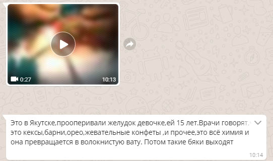 Отмечается, что трихобезоар не мог появиться из-за чрезмерного употребления сладкого. В минздраве также подчеркнули, что съемка велась с разрешения родителей пациента для использования в учебных целях.