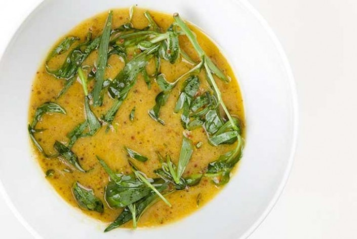 1. Крупно порубите тархун, добавьте воду, мед, два вида горчицы и растительное масло.