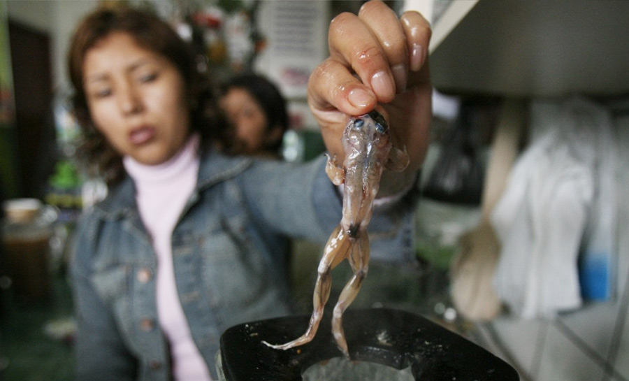 Лягушка без кожи является одним из ингредиентов традиционного напитка, который готовят в Перу, например, на рынке в Сан-Хуан-де-Луриганчо, Лима.