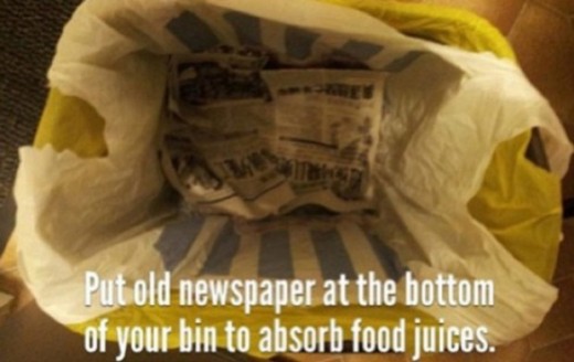 Всем знакома ситуация, когда вы извлекаете мусорный мешок, а с него начинает что-то предательски капать прямо на пол. Чтобы этого избежать, кладите старую газету на дно ведра.