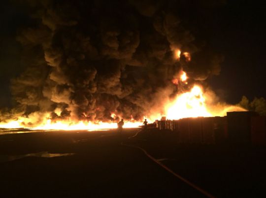 "Огонь покрывал площадь примерно 100 на 100 метров, можно сказать, выложенную пластиковыми ящиками", - рассказал пресс-секретарь пожарно-спасательной службы.