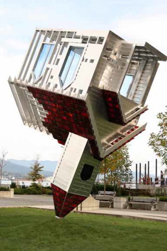 Высотой около 8 метров, заключенная в алюминиевую раму и отделанная красным стеклом "церковь" нашла свое место посреди парка в Калгари, Альберта. Американский скульптор Деннис Оппенгейм описывает свой проект так: "Переворот церкви с ног на голову имеет несколько агрессивное, но не богохульное настроение", однако согласны с мастером оказались не все.