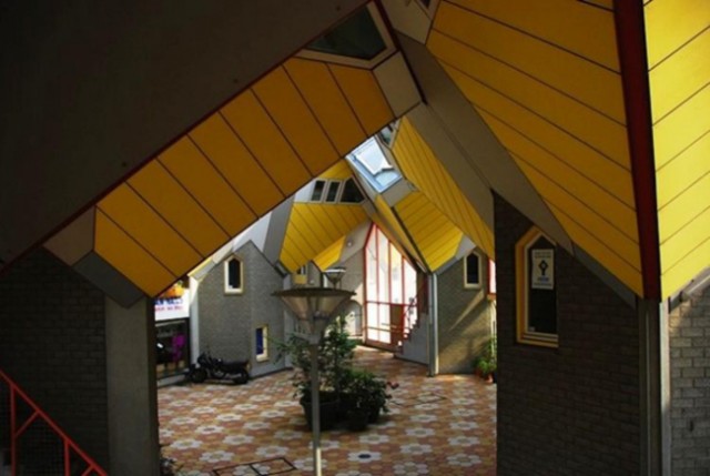 Так называемые "Кубические дома" или "Дома-кубы" выглядят совершенно безумно, но на деле оказываются блестящим примером продуманного творческого подхода. Установленный под углом в 45 градусов на шестигранной колонне параллелепипед каждого дома надежно соединен с соседним. Результатом дерзкой задумки явилась постройка с высокой плотностью и удивительным видом.