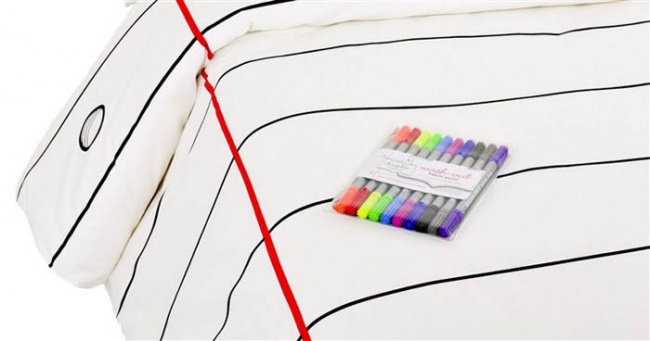 В комплект белья от Doodle by Stitchвходит белая разлинованная ткань и цветные фломастеры с водорастворимыми красками. После каждой стирки белье вновь будет белоснежным.