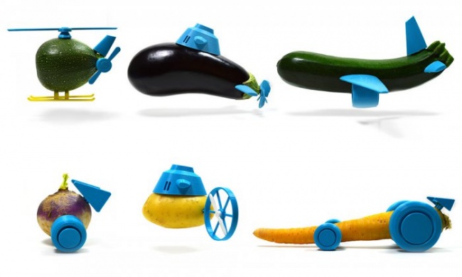 Французские дизайнеры из le FabShop придумали серию игрушек Open Toys. Они крепятся к овощам и позволяют малышам "помочь" маме с готовкой еды.