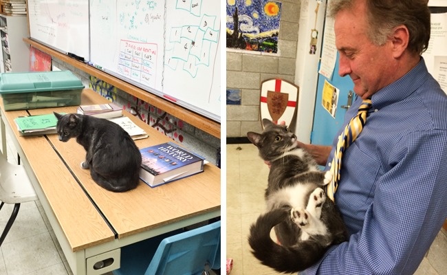 Учитель принес своего кота на урок. Каждый раз, когда он задавал вопрос классу, кот мяукал, и это засчитывалось за ответ.
