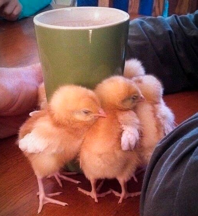 3-дневные цыплята наслаждаются теплом моей кофейной кружки.